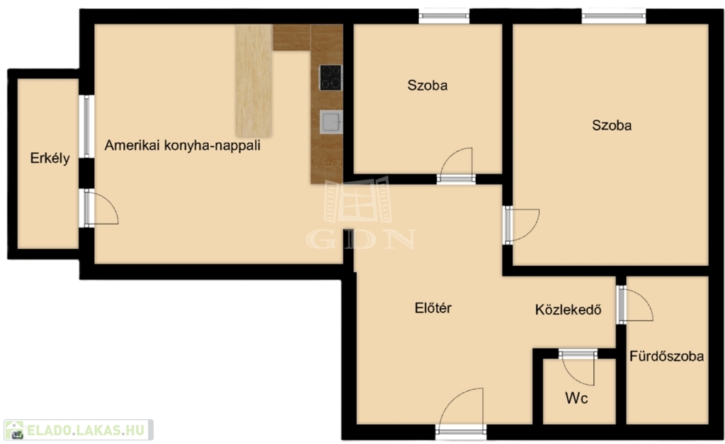 - A lakás központi tere a modern amerikai konyhás nappali, ahonnan közvetlen kijárat nyílik a 3 m²-es erkélyre. A fürdőszoba és a WC külön helyiségben található, ami praktikus és kényelmes megoldás a mindennapokban.