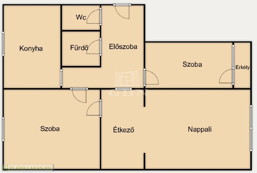 kényelmes elrendezés hallal, külön WC-vel és beépített erkéllyel.