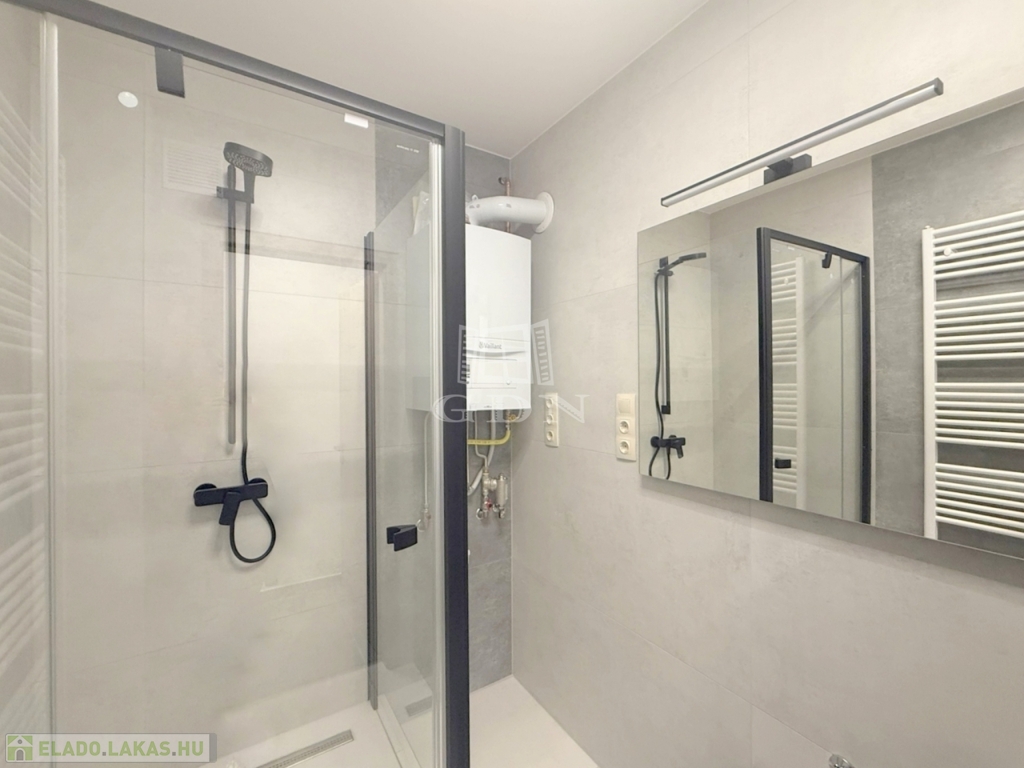 A világos ingatlan melegvízellátásáért és melegéért egy új gázkazán felel, utóbbi lapradiátor hőleadókal, melynek alternatívájaként a mindkét hálóban található inverteres hűtő - fűtő klíma használható.