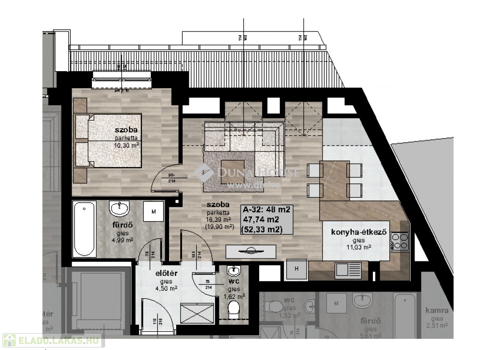 - hidegburkolatos helyiségekben padlófűtés, egyéb helyiségben radiátoros fűtés