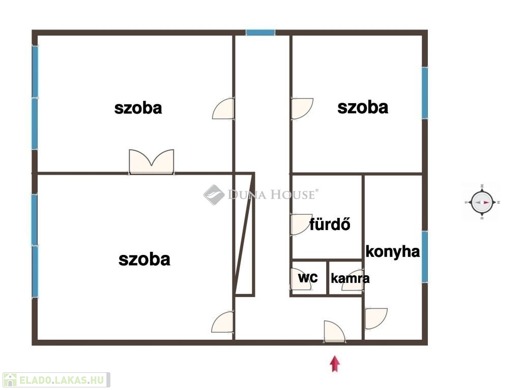 Az ingatlan praktikus elrendezésű: a beépített szekrényes előszobából három kényelmes méretű szoba nyílik, külön fürdő és WC szolgálja a komfortot. A közlekedő végén található a világos konyha étkezővel, valamint egy hasznos kamra is helyet kapott.