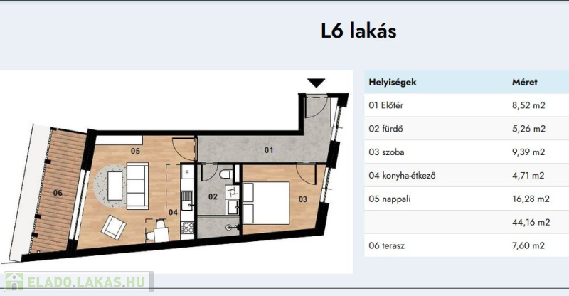 - 44,16 négyzetméter, alacsony energiaigényű, 7,6négyzetméteres terasszal