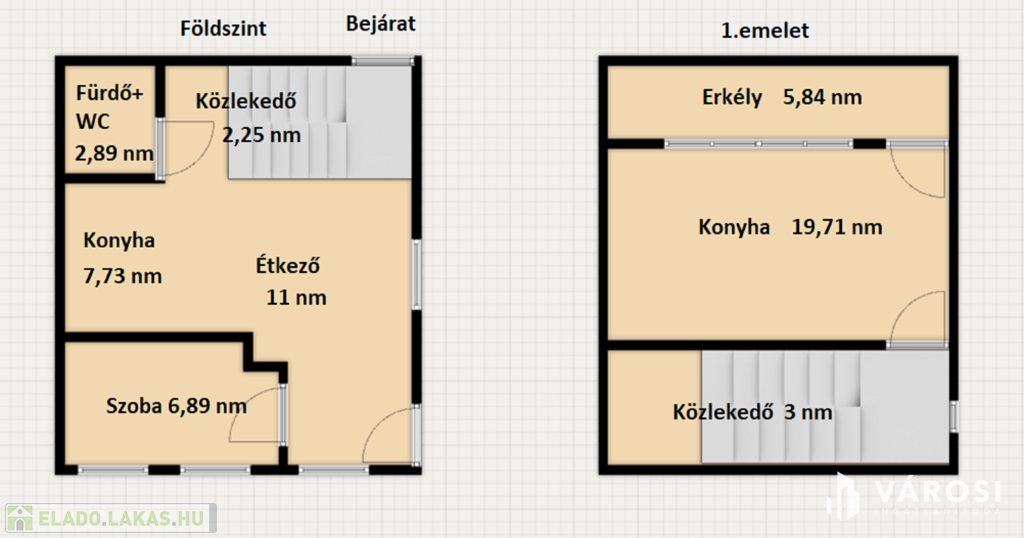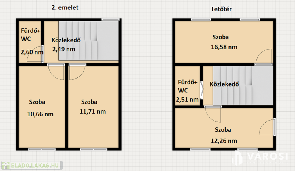 A 2. emeleten kettő szoba, egy 11 nm és egy 12 nm nagyságú szoba van, ezekhez tartozik egy közel 3 nm nagy zuhanyzó+ WC.