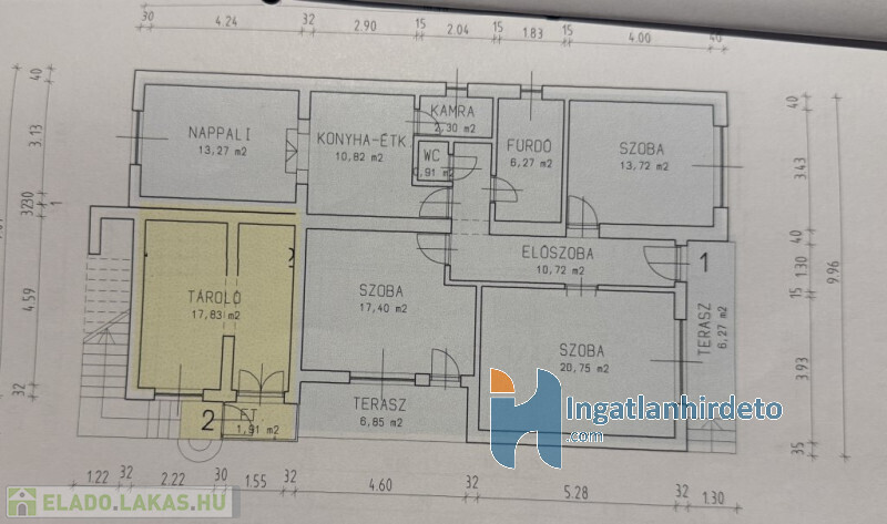 A lakás alapterülete 103 nm, elrendezése 4 szoba, konyha étkezővel, fürdőszoba, WC és kamra.