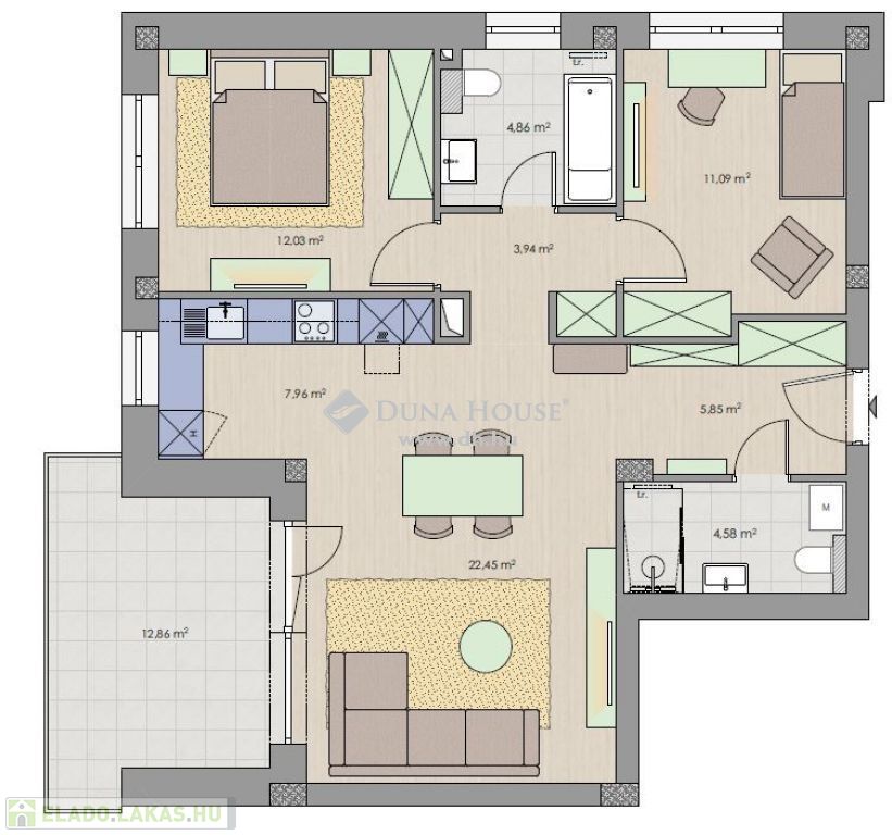 magas műszaki felszereltségre (hőszivattyús fűtés, klíma, modern nyílászárók, redőnyelőkészítés, igényes burkolatok)