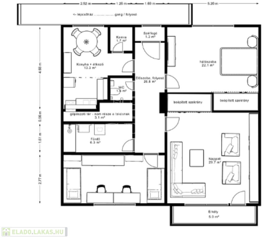 Tárolásra nagyon praktikus lehetőséget nyújt a két szobában is elhelyezkedő beépített szekrény.