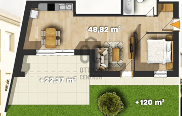 Hasznos alapterülete : 48,28 m2 + 22,37 m2 terasz + 120 m2 udvar kapcsolatos.