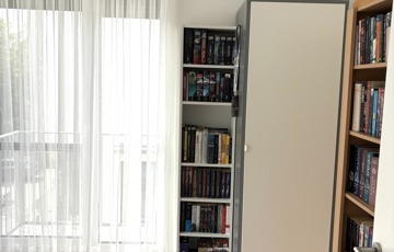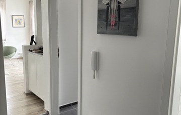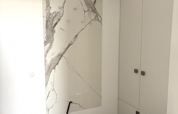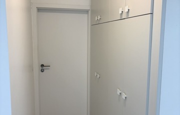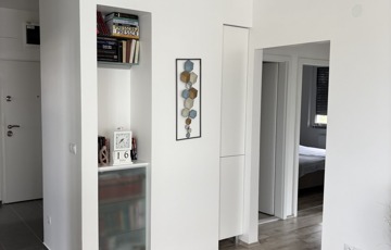 Az egyedi, beépített bútorok letisztult megjelenést kölcsönöznek minden helyiségnek.