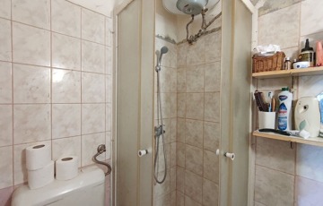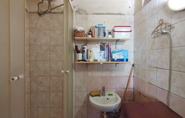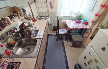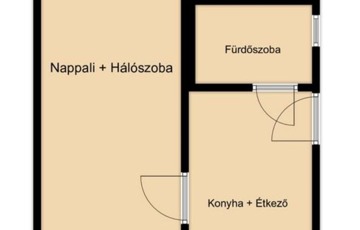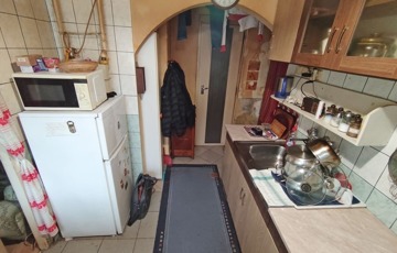 A lakásba belépve a bejárati ajtón keresztül közvetlenül a nyitott világos konyhába jutunk. Innen jobbra nyílik a fürdőszoba, ami teljes felújításra szorul. A konyhából nyílik a nappali ami egyben a hálószoba is.