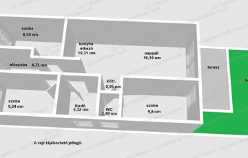 Lakótér 66,55 nm (nappali + 3 szoba) fürdő - WC (egyben és külön) padlástér cca. 6 nm, lenyitható lépcsővel.