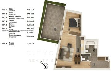 A liftes társasház 1. emeletén található, 58,23 nm-es, (54,25 nm lakás 21,82 nm terasszal) 2 szobás lakás korszerű hőszivattyús fűtés–hűtéssel és teljes körű okosotthon-rendszerrel felszerelve várja új tulajdonosát. A burkolatok még választhatók, így a leendő tulajdonos saját ízlésére szabhatja az ingatlant.