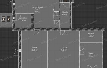 Előszoba, étkező konyhás nappali, plusz három szoba; ez utóbbi könnyen 3 és fél szobává alakítható, de átalakítással több lehetőségre is van mód. Belmagasság 3,10 m.