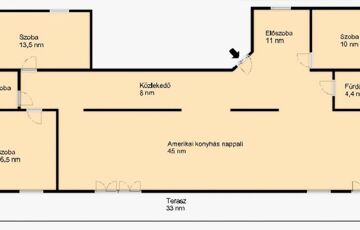 A nagy, napfényes, amerikai konyhás nappali a családi élet központja, míg a két tágas hálószoba és a harmadik, jelenleg dolgozószobaként használt helyiség kényelmes privát tereket biztosít. A két teljes értékű fürdőszoba tovább növeli a mindennapok kényelmét.
