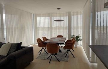 A nappali tágas, világos, a padlótól plafonig érő üvegfelületeknek köszönhetően a térérzet rendkívül kellemes. A gépesített konyha tűzhellyel, sütővel, szagelszívóval és mosogatógéppel felszerelt.