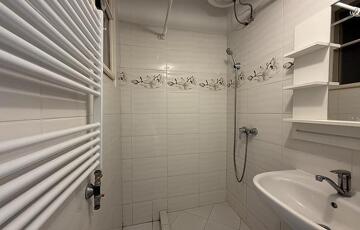 A fürdőszobában beépített zuhany van. Wc külön helyiségben.