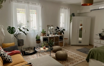 A lakás egy tágas szobából áll, melynek ablakai a kellemes kertre néznek, így garantálva a nyugodt, természetközeli életérzést.
