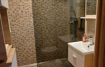 egyenesen nyílik balra a fürdőszoba, külön WC, majd a konyhát találjuk.