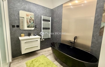 A master bedroom különlegessége az üvegfalú, PDLC fóliás (tejjüveges) fürdő, amely egyedülálló látványt nyújt. A csaptelepek digitális hőfokkijelzővel, a tükrök és világítások beépített LED rendszerrel működnek.