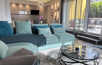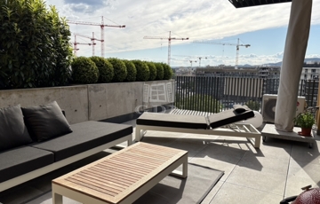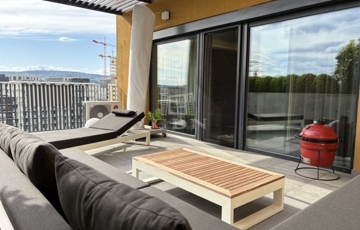 A lakáshoz dél–nyugati tájolású, privát napozóterasz tartozik, felsőkategóriás kerti bútorokkal, napernyővel, és lenyűgöző panorámával a budai hegyek felé. A terasz teljes intimitást biztosít, a növényeket automata öntözőrendszer látja el.
