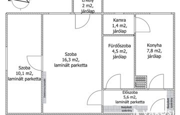 A padlóburkolatok laminált parketta, és járólapos kivitelűek.