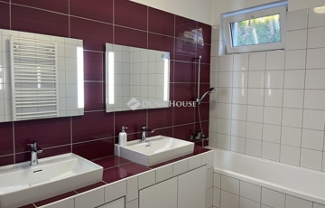 Az alagsorban vizesblokk is kiépítésre került, továbbá több tárolóhelyiség és dupla aknás garázs is helyet kapott, ami praktikus megoldást nyújt mindennapi használatra.