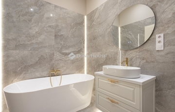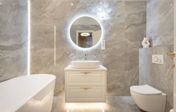 A tágas, napfényes amerikai konyhás nappali impozáns megjelenését designer világítás, minőségi anyagok és az arányosan kialakított terek adják. A két hálószoba saját fürdővel rendelkezik az egyik káddal, a másik zuhanykabinnal felszerelt.