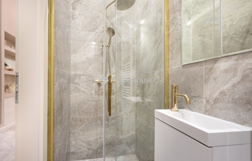 The spacious, sunlit living room with open-plan kitchen creates an impressive atmosphere, enhanced by designer lighting, high-quality finishes, and a perfectly balanced layout. Each bedroom has its own private bathroom one with a bathtub, the other with a shower.