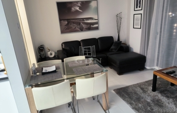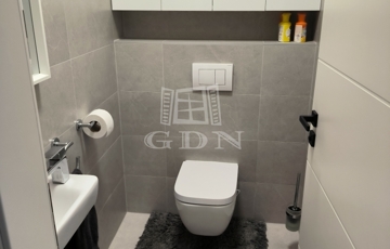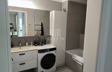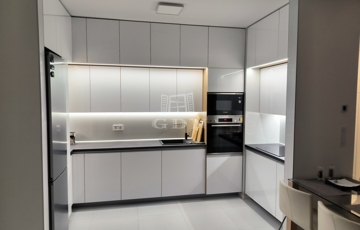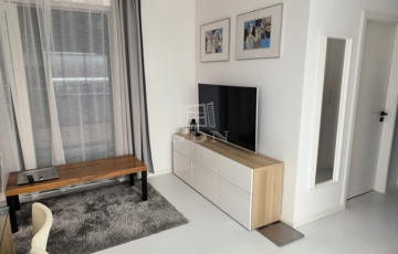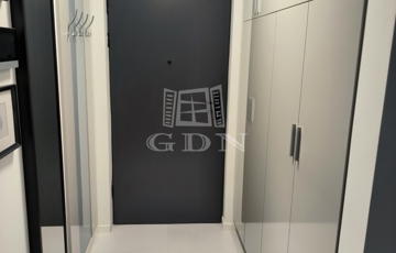 A lakásban az újszerű amerikai konyhás nappaliban beépített konyhabútor, az előszobában pedig előszobaszekrények találhatók, valamint fehér fényes, csillogó járólapok a közlekedőben és a nappaliban ahonnét a fürdőszoba és a WC nyílik.