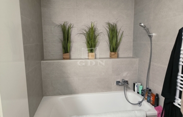 A fürdőszoba kádas és mosdókagylóval is felszerelt, csempézett.