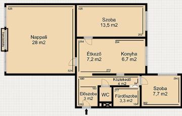 Az ingatlanban egy hatalmas 28 nm-es, franciaerkélyes nappali található, illetve egy 13,5 nm-es szoba és egy 7,7 nm-es félszoba. Az étkezőt és a konyhát jelenleg egy konyhabútor szeparálja el, de igény szerint a két helységet tovább lehet nyitni a nagyobb térérzet érdekében. Fürdő és WC külön került kialakításra. Sajátossága a lakásnak, hogy az alapvetően sötétebb közlekedő folyosó falán itt egy „ablakot” helyeztek el, amelyen keresztül fény áramlik be, így világosabb érzetet kelt, mint a többi hasonló elosztású ingatlan.