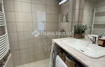A modern, zuhanyzós fürdőszoba és a külön WC a felújítás során megújult, letisztult, időtálló stílusban.