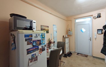 Belépve a lakásba a bejárattal szemben a 17 nm-es keleti fekvésű világos szobába juthatunk, ami reggelente fényárban úszik. A 8 nm-es járólapos előtérben balra nyílik a világos, kis ablakos 3,5 nm-es, csempézett épített zuhanyzós fürdőszoba, amely magában foglalja a WC-t is. Az előtérből tovább haladva szintén balra találjuk a 2,5 nm-es, gáztűzhellyel felszerelt, bútorozott főzőfülkét, amiben a mosógép is helyet kapott.