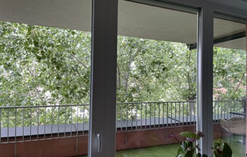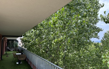 Az 55 m²-es terasz az év nagy részében túlzás nélkül valódi élettérként működik. Viszonylag intim, az utcáról nem látni fel rá, a szomszéd házak kellő távolságban vannak. A délelőtti nap a konyha felőli oldalra süt, a délutáni a szobák elé — évszaktól függően jól variálható a terasz használata. A kilátás igazán szép, a szobák felöli oldalon a kertvárosra és a Budai hegyekre látunk rá meglepően messzire. A kedvencünk pedig a terasz előtti nagy fa, aminek a lobkoronáját látjuk a szobákból is. Tettem fel a teraszról képeket a tavaszi időszakból is, az aktuális képek mellett.
