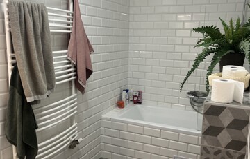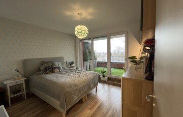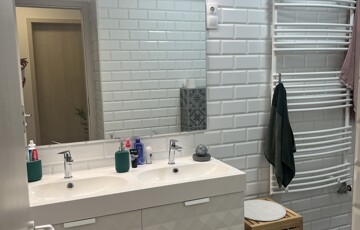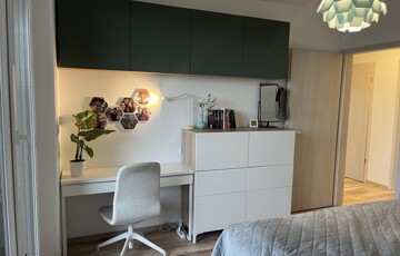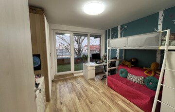 Három szoba (13 m², 13 m² és 9 m²), a legnagyobból nyíló, 3,5 m²-es gardróbbal (eredetileg zuhanyzónak tervezve, a kiállások megvannak hozzá). Tágas, több mint 7 m²-es fürdő WC-vel, valamint külön háztartási helyiség, ami lehetővé teszik, hogy a fürdőben ne kelljen gépeket vagy vegyszereket tárolni.