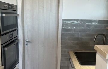 Tágas előszoba, külön vendég WC, amerikai konyhás nappali-étkező. A konyhabútort gondosan megterveztük, gipszkartonnal körbeépítettük, a konyhai vizesblokkot (mosogató, mosogatógép) pedig egy félfal mögé helyeztük, ami nem szűkíti a teret, de lehetővé teszi, hogy elrejtsük mögé az időszakos kupit. A konyhából egy 2 nm-es praktikusan bepolcozott kamra is nyílik.