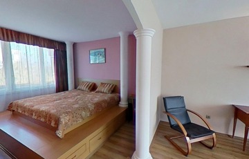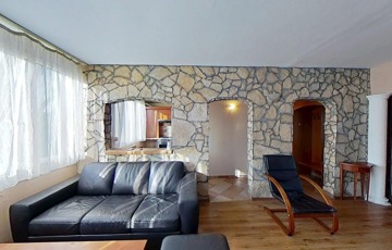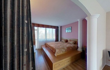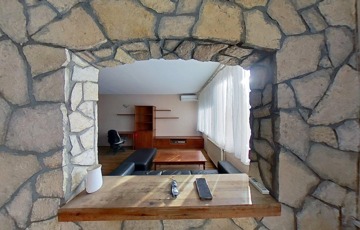 A klimatizált lakás egyedi megjelenését a hálószobában az oszlopok, a dobogós ágy, és a tereket részben leválasztó rusztikus hatású kőfal adja. Lényegében a fürdő és az illemhelyiség kivételével nincsenek elválasztó ajtók, így a nappali, előtér, konyha és hálószoba egy légtér. Az előtérben egyedi tervezésű mindent elnyelő beépített szekrény kapott helyett, melynek színe harmonizál a biztonsági bejárati ajtóval, és a konyhabútorral, ami gépesítéssel együtt a vételár részét képezi.