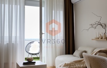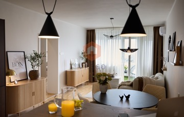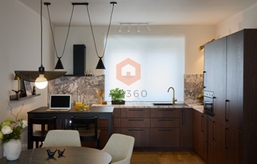 -amerikai konyhás tágas, napfényes nappali, konyhapult teljesen gépesített, indukciós főzőlappal, sütő, mikrohullámú sütő, páraelszívó, hűtő, mosogatógép, kombinált mosó-szárítógép