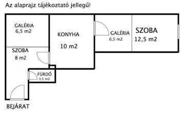 Mindkét szobában 6,5 m2-es galéria lett kialakítva, így növelve a lakóteret. A nagyszoba ablaka utcára néz, a bejárat az udvarról történik.