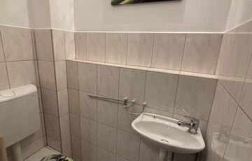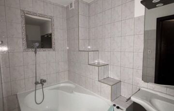 A tágas fürdőszoba nagy sarokkáddal és külön zuhanyzóval rendelkezik, amely egyszerre nyújt kényelmet és praktikusságot a mindennapokban.