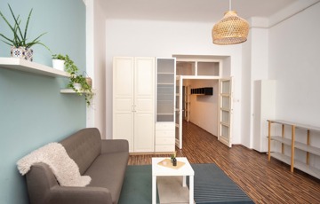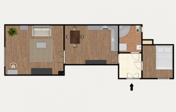Az elrendezés kiegyensúlyozott és átgondolt, a déli tájolású, utcai nézetű nappali világos, elegáns élettérként szolgál a mindennapokhoz, míg a belső udvarra néző hálószoba csendesebb, intimebb környezetet biztosít a pihenéshez. A különnyíló szobák jól elkülöníthető, harmonikusan használható tereket hoznak létre.