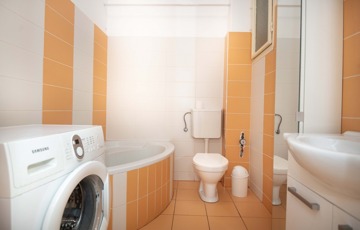 A fürdőszoba sarokkádas kialakítású, amely egy hosszú nap végén valódi felüdülést kínál.