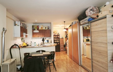 A társas házban a lakóközösség tagjai barátságosak, segítőkészek, a lakás kiváló elhelyezkedésű, frekventált helyen található. A lakás K-i fekvésű, földszinti elhelyezkedése ellenére is kellően világos. Az utcáról kocsival elektromos kapubejárón keresztül jutunk be a zárt közös udvarba, ahol minden tulajdonos számára van lehetőség parkolni. A zárt lépcsőházon keresztül érkezünk a közös folyosóra ahonnan a jó minőségű fa ajtón keresztül jutunk a lakásba. Belépve az előszobával szemben a kádas fürdőszoba nyílik, amiben a toalett is helyet kapott. Balra fordulva a közlekedőből a tágas gépesített, amerikai konyhás, ebédlős nappali tárul elénk. Ebben a nagy térben jobbra a konyhai részt egy félkör alakú pult választja el, ami előtt egy étkező asztal is bőven elfér, szolgálva a komfortos étkezést a család számára. A nagyon tágas helységben, bőven marad hely a pihenésre szánt nappali rész kialakítására is. A szoba a mellékutcára néz ennek ellenére csendes, világos. A lakásban a két éve beépített klíma szolgálja a komfort érzetet nyáron.