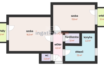 19,26m2, szoba 17,81m2, fözőfülke 2,17m2, étkező 7,52m2 fürdőszoba 3,11m2, wc 0,85m2, előszoba 4,24m2, erkély 3,1m2, erkély 3,1m2;