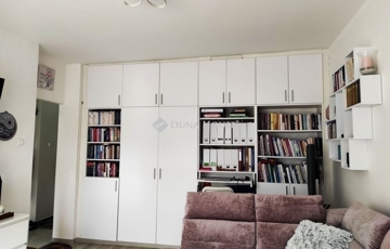 - erkélykapcsolatos, tágas nappali, egyik fal mentén mennyezetig érő beépített szekrénnyel, polcos, akasztós, fiókos elemekkel