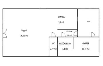 A két szinten kialakított lakótér csiga lépcsővel van összekötve. Az alsó szinten található konyha, nappali, wc kézmosó, mosókonyha, garázs. A felső szinten 3 szoba és fürdőszoba.