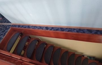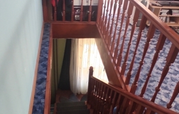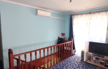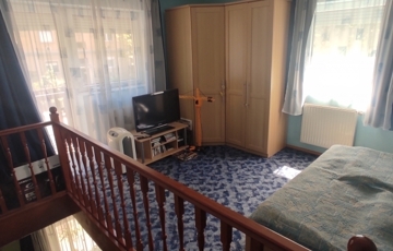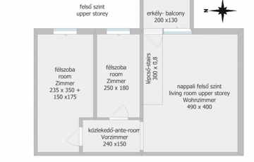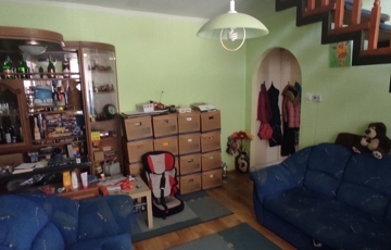 A lakás bejárata a magasföldszinten van, a felső szintre az alsó nappaliból nyíló lépcsőn lehet felmenni.