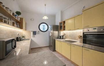 A 223 négyzetméteres lakás jelenleg két külön lakrészre van osztva, így többféle élethelyzethez is jól alkalmazkodik. Ideális lehet többgenerációs család számára, de akár külön lakrész, vendéglakás vagy kiadás céljára is használható. Igény esetén az eredeti állapot könnyen visszaállítható, így ismét egy nagy, egybefüggő lakótér alakítható ki.