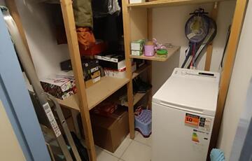 A cserélt bejárati ajtó előtt, egy külön 6 nm-es , ráccsal leválasztott teret is találunk, ahol bringát, rollert, vagy más ritkán használt eszközöket is bátran lehet tárolni, amivel nem szeretnénk a lakás hasznos területét elvenni.