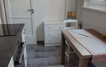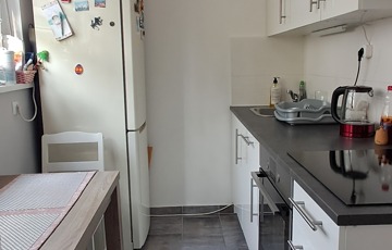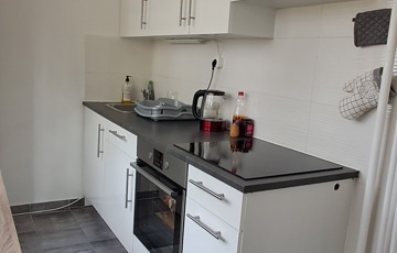 Konyha teljesen felújított, járólapos, ikea konyhaszekrény, beépített sütő és indukciós főzőlap.