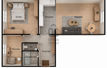 Székesfehérváron, a Belvárosban található ez a praktikusan átalakított lakás, amely eredetileg a klasszikus 2 szoba hallos volt. A tulajdonos a konyhát a hall részbe költöztette, így a nappalival egy légtérbe került. A konyha helyén egy félszoba lett kialakítva.